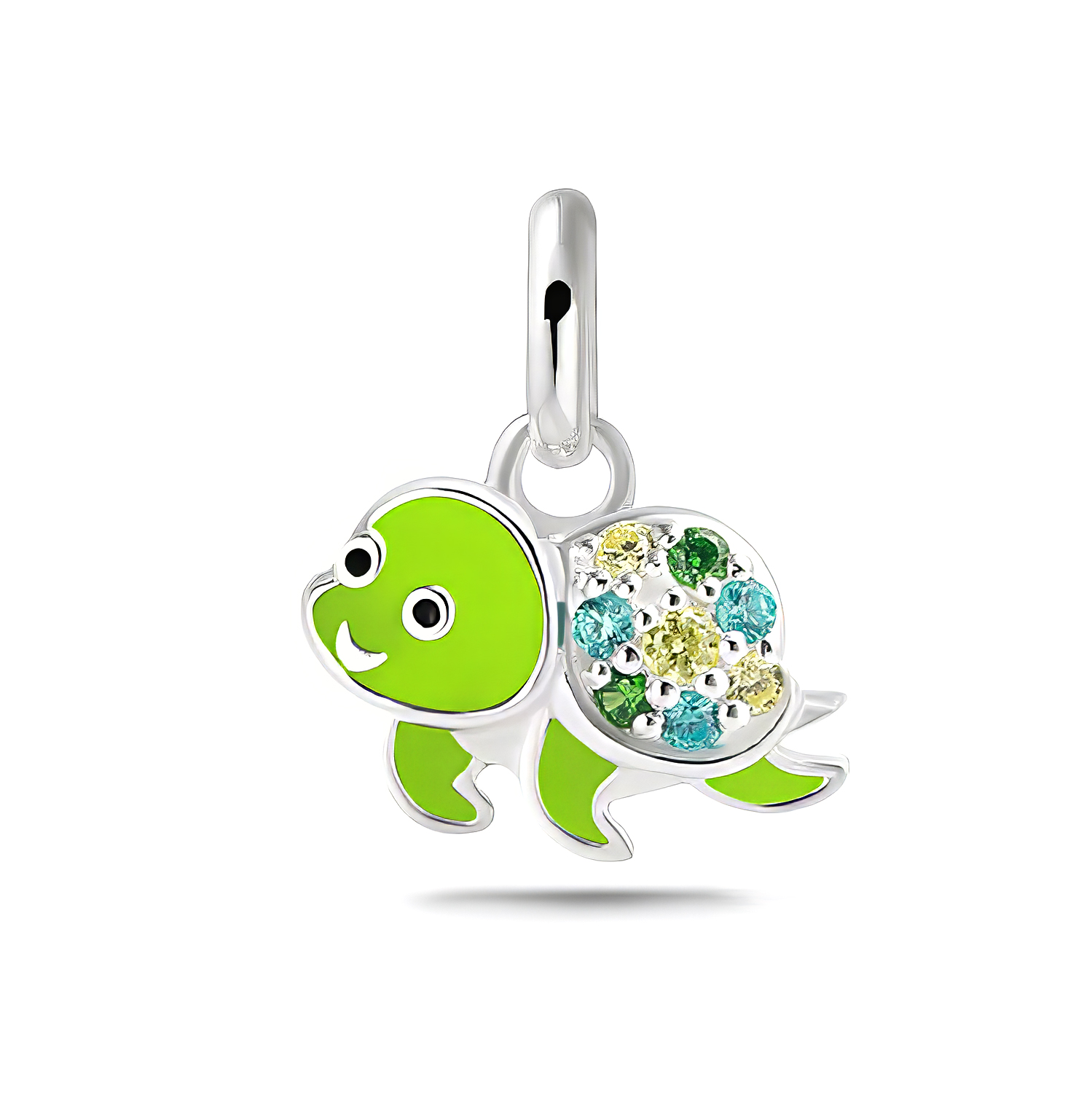 Anhänger Schildkröte mit 8 Zirkonia: 3x blau, 2x grün 3x gelb. Lack in hellgrün und schwarz