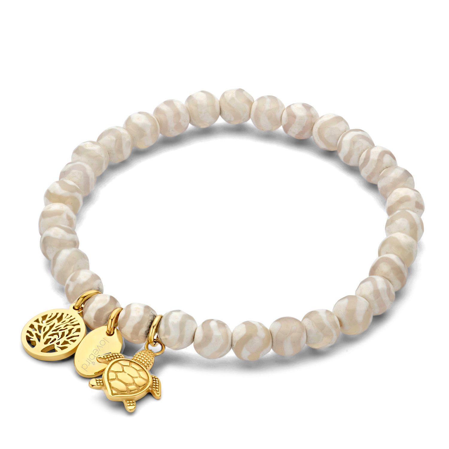 Lovebird Armband mit Achat weiß/beige/hellbraun, Lebensbaum und Schildkröte