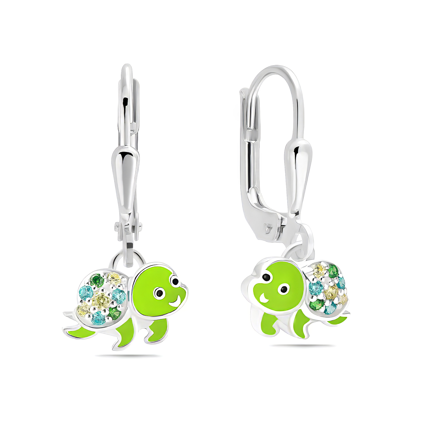 Ohrhänger Schildkröte mit 8 Zirkonia: 3x blau, 2x grün 3x gelb. Lack in hellgrün und schwarz